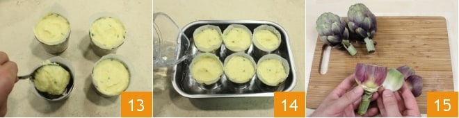 Once you have incorporated the egg whites, take 6 molds with a capacity of about 5.4 oz each; butter them and line them with parchment paper, then divide the mixture into six equal parts, filling the molds to the edge 13. Place the molds in a high-rimmed baking dish and fill it with hot (but not boiling) water up to 3/4 14, to cook in a bain-marie in the oven: this way the right humidity will be created so the flans remain soft and don't dry out too much during cooking. Bake in a preheated static oven at 356°F for 1 hour (if using a fan oven, at 320°F for 50 minutes). Meanwhile, prepare the artichoke salad: clean the artichokes by cutting off the sharper top part and peeling them until you reach the more tender leaves 15.