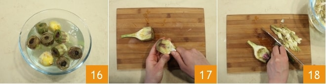 Then clean the stem by removing the outermost part and immerse the cleaned artichokes in a bowl with water and lemon to prevent them from darkening 16. At this point, cut the artichokes in half and with a knife remove the inner fuzz 17, then cut them into julienne strips 18