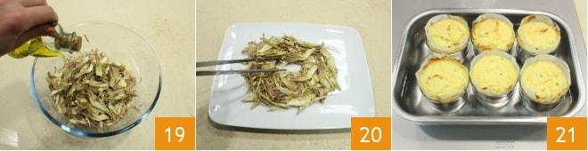 and drizzle them with a little olive oil 19; you can season to taste with salt and pepper to flavor them. Distribute the artichoke salad on a serving plate 20. Once the potato flans are cooked, take them out of the oven 21 and let them cool slightly.