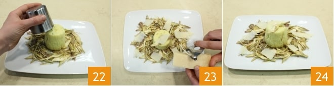 Turn the potato flan over in the center 22, take the Parmigiano Reggiano and make shavings 23 to distribute over and around the potato flan with artichoke salad 24!