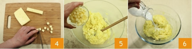 Take the Tilsit cheese and cut it into cubes 4, then add it to the bowl with the potatoes 5. Also add the Pecorino, then the lukewarm milk gradually 6,