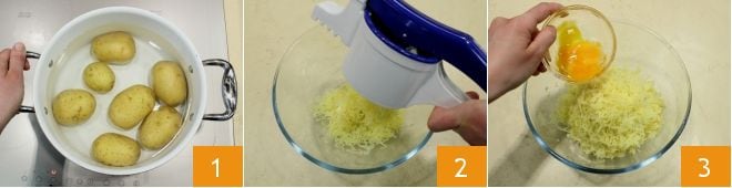 To prepare the potato flan with artichoke salad, start by boiling the potatoes 1: cook them until you can pierce them with a fork (to shorten cooking times you can use a pressure cooker). Once cooked, drain them and let them cool slightly. Then mash them with a potato masher, collecting them in a bowl 2; separate the whites from the yolks and add the yolks to the potatoes 3, stirring with a wooden spoon to absorb them.
