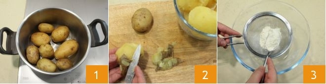 To prepare the potato gnocchi with pesto, mussels, and clams, start with the preparation of the gnocchi. Wash the potatoes well to remove dirt. Take a pot with high sides, fill it with water, salt it, and bring it to a boil. Then, add the potatoes and let them boil for about 30-40 minutes depending on the size of the potatoes 1 (you can halve the cooking time using a pressure cooker). Test them with the prongs of a fork to check their doneness. While still hot, peel them 2. Now take a large bowl and sift the flour into it 3.