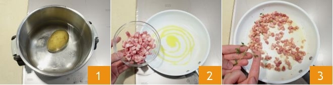 To prepare the potato muffins, start by boiling the potato in slightly salted water 1; cook it until you can pierce it with the prongs of a fork (this will take about 30 minutes, but you can halve the time using a pressure cooker). Meanwhile, in a pan, heat a drizzle of oil and pour the diced smoked bacon 2; let it render for a few minutes and season it with thyme leaves 3.