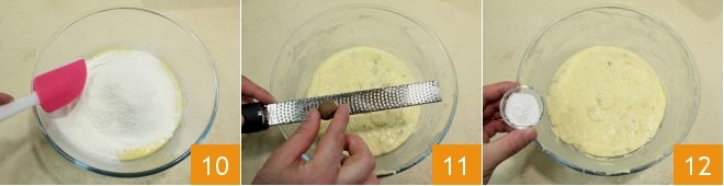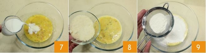 then add the milk 7 and the grated Grana Padano cheese 8, after which sift the flour into the bowl 9