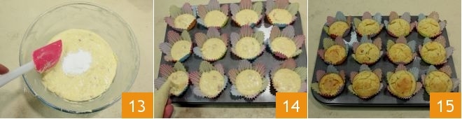 Mix everything again with the spatula 13 and transfer the obtained mixture into a piping bag. Line a muffin tray with colorful paper cases and fill them with the batter to the brim 14 (so that they rise in the typical mushroom shape when baking). Bake them in a preheated static oven at 356°F for about 20 minutes (320°F for about 15 minutes if using a convection oven). Once baked, take the potato muffins out of the oven 15 and let them cool slightly before serving!