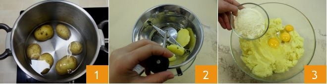 To prepare the potato pie with cotechino ragù heart, first prepare the potato-based dough: wash the potatoes under running water, scrubbing them to remove dirt, then place them in a pot, cover with water 1, and cook for at least 30 minutes or until you can pierce them with a fork. When ready, peel them and pass them through a food mill 2, collecting the puree in a bowl. Then add the eggs and grated cheeses 3.