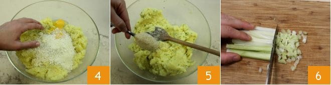 Add the salt and a pinch of pepper, and knead the ingredients with your hands to incorporate the eggs and blend the cheeses 4. Then add finely chopped parsley and breadcrumbs 5. Now that you have the potato dough, set it aside. Start preparing the soffritto for the ragù: take the celery stalk, remove the outer green strings with a vegetable peeler, then cut into strips 6, and finally into small cubes.