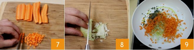 Do the same with the carrots, cleaned and trimmed at the ends 7, and then with the peeled and finely chopped onion 8. Place the chopped celery, carrot, and onion in a large pan with a drizzle of oil and add the chopped sage 9. Sauté over low heat, adding a little water if necessary to prevent the vegetables from burning.