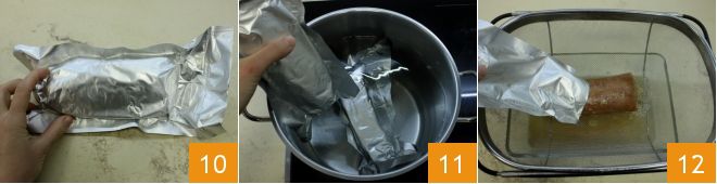 Meanwhile, boil the pre-cooked cotechino: take them with the entire casing 10 and place them in a large pot filled with water 11. Cook for about 20 minutes, following the instructions on the package. When ready, drain them in a colander, opening the package and letting all the internal liquid drain 12, being careful not to scald yourself.