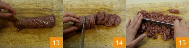 Then place the cotechino on a cutting board, gently remove the skin 13, slice them 14 and then finely chop the meat with a knife 15.