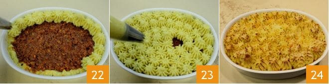 When the ragù is ready, you can start assembling the potato pie: take an oval baking dish, brush it with a little oil and sprinkle with breadcrumbs 19. Then lay down a layer of potatoes, making it adhere to the edges. Pour the cotechino ragù on top and flatten with the back of a spoon.