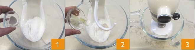 To prepare the pretzel buns, start by sifting the flour into a stand mixer equipped with a dough hook. Add the yeast 1 and butter at room temperature 2. Start working the dough, turning the hook on at low speed, and gradually add the water at room temperature 3.