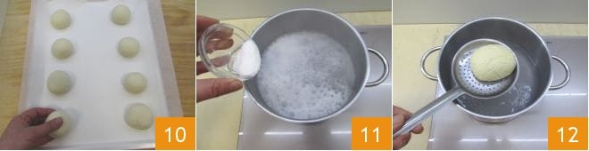Seal carefully, forming a ball, and place it on a sheet lined with parchment paper, keeping the smooth side up 10. Continue this way with all the other balls, then cover with a clean cloth and let your buns rise in the oven turned off with the light on for about 2 hours, or until doubled in volume. Once risen, bring a pot of water to a boil. Lower the heat and gradually add the baking soda to the pot 11. Dip your buns one at a time 12.