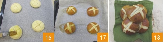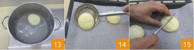 and let them boil for 30 seconds 13, turning them on both sides. Drain them with a slotted spoon and place them gently on the baking sheet lined with parchment paper where you intend to bake them 14. With a sharp knife, make a deep cross cut on the surface of the buns 15.