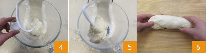 Once the water is incorporated, let the hook work for another minute, so that the dough comes together; then add the salt 4. Increase the speed (from low to medium) and continue kneading for 7-8 minutes. After this time, the dough should be well kneaded 5. Transfer it to the work surface and use your hands to form a log 6.