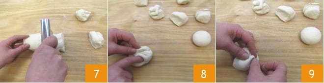 Use a dough scraper to divide the log into 8 pieces of 2.3 oz each 7. Give each piece reinforcing folds by gathering the side edges towards the center 8 and then doing the same with the top and bottom edges 9.