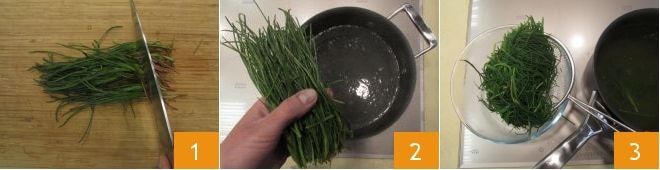 To prepare the puff pastries with agretti and nduja, start with the cleaning of the agretti. Remove the base with a knife (you will get about 8 oz usable) 1 and then boil them for a couple of minutes in hot water 2. As soon as they are slightly softened, dip them in a bowl of ice water to stop the cooking, and the color will remain bright 3.