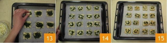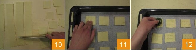 and then into squares to obtain 30 pieces of 2x2 inches each 10. As you go, place the squares on a baking sheet lined with parchment paper and press gently in the middle with your fingertips 11. Place a small heap of agretti 12,