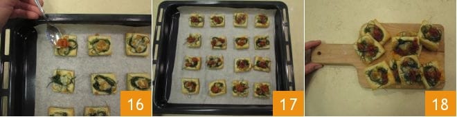 Take the tray out of the oven and place a bit of nduja on the puff pastries with a teaspoon 16 until they are all filled 17. Your puff pastries with agretti and nduja are ready to be enjoyed hot or even cold 18!