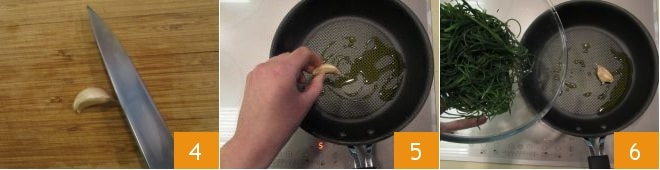 Meanwhile, you can crush one unpeeled garlic clove with the back of a knife 4 and place it in a pan with a little oil 5. Then, as soon as the base is hot, drain the agretti and add them to the pan 6.