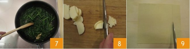 Sauté them well over high heat for a couple of minutes; season with salt and pepper and mix well 7. Set them aside to cool and turn to the scamorza cheese. Cut it into small cubes and set these aside as well 8. Cut the puff pastry into strips first 9