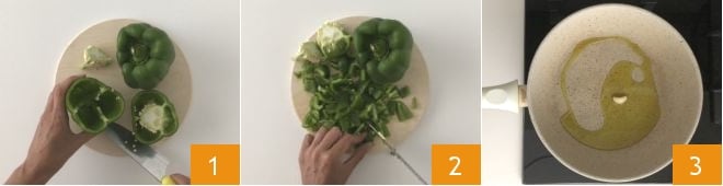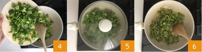 Remove the garlic clove and add the peppers 4, sauté them for a minute, season with salt and black pepper, and cover the pan with a lid 5. Let the peppers cook for about five minutes, stirring occasionally to ensure even cooking. When done, turn off the heat and set aside 6.