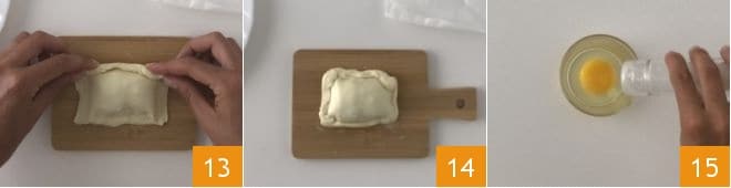 Seal the edges well with your fingertips and fold them over themselves (13-14). In a small bowl, break the egg, add salt 15 and beat it with a fork.
