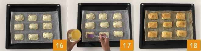 Place the puff pastries with peppers and gorgonzola on a baking tray lined with parchment paper 16 and then brush the surface with the egg 17. Bake the puff pastries with peppers and gorgonzola in a preheated oven at 356°F and let them bake for about 15-20 minutes until they are golden on the surface. Once cooked, take them out of the oven 18 and let them cool slightly before serving.