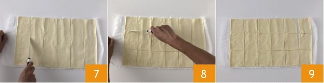 Unroll the rectangular puff pastry sheet and cut it vertically to get 6 strips 7. Then cut it horizontally into 3 parts 8, thus obtaining 18 small rectangles 9.