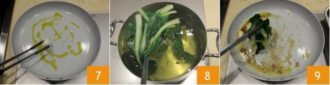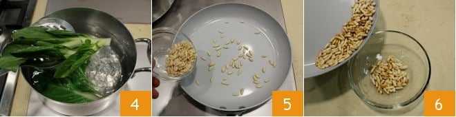 Boil them for 5 minutes in salted water. Meanwhile, in a separate pan, toast the pine nuts over medium heat in a non-stick pan 5, stirring occasionally to prevent burning. When they are lightly golden, transfer them to a small bowl and set aside 6.