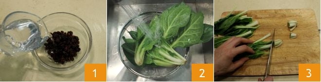 To prepare the puff pastries filled with chard, pine nuts, and raisins, start by soaking the raisins in a small bowl with water 1; then rinse the chard under running water 2, trim them to remove the stalk 3