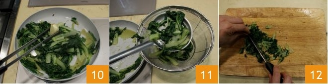 Remove the garlic 10, turn off the heat, and drain the chard 11; let them cool, then finely chop them 12.