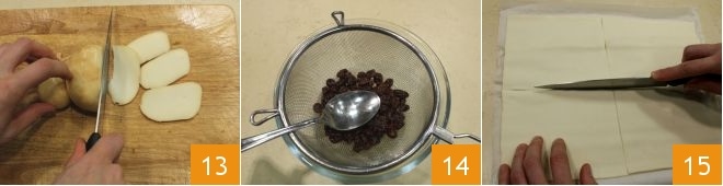 Slice the smoked scamorza cheese 13 and drain the raisins from the soaking water 14. Then roll out both rolls of ready-made puff pastry and divide them into 4 equal parts with a sharp knife 15.