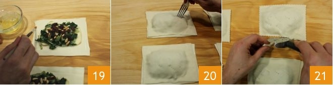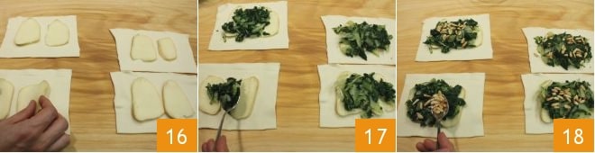Place 2 slices of smoked scamorza cheese on 4 rectangles each 16, then the sautéed chard 17, followed by the toasted pine nuts 18 and drained raisins: leave a couple of centimeters from the edges of the puff pastry.