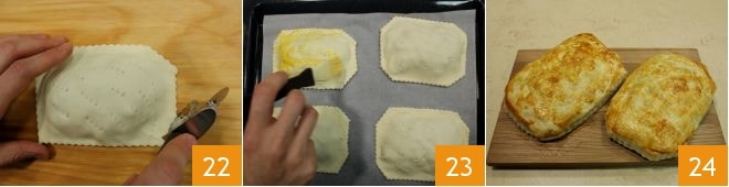 You can also trim the excess corners 22; then place the 4 filled puff pastries on a baking sheet lined with parchment paper and brush the surface with a beaten yolk 23. Bake in a preheated static oven at 356°F for about 25 minutes or until golden (if fan-assisted, at 320°F for 15-20 minutes). Once cooked, remove from the oven and let them cool slightly before serving 24!