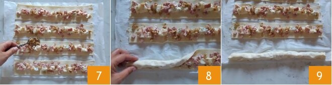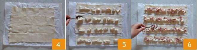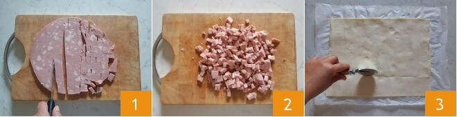 dividing it into 4 equal rectangles 4. Now you can fill the pastry: distribute the gorgonzola in pieces 5 and the cubes of mortadella 6