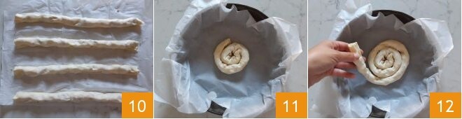 Do the same with all the rectangles of puff pastry 10, then line a round baking pan with parchment paper with a diameter of approximately 9.5 inches and in the center, coil a first strip in a spiral 11, continue with the second, making the ends adhere well 12