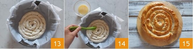 Continue in the same way with the other strips 13. Your snail has taken shape, brush the surface with the egg mixed with milk 14 and bake in a preheated static oven at 375°F for 25-30 minutes. Once cooked, your puff pastry snail will be golden brown, take it out of the oven and let it cool slightly before serving 15.
