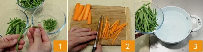 To prepare the puff pastry with ham, ricotta, and vegetables, start with the vegetables: wash all the vegetables, then trim the green beans 1, shell the peas, and peel the carrots, then cut them into strips 2. In a pot, heat plenty of water, and when it boils, add the green beans 3