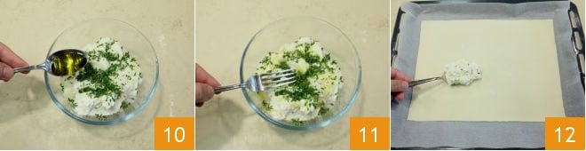 also add salt and pepper to taste, the oil 10, and mix everything with a fork 11. Place a rectangle of puff pastry on a baking sheet lined with parchment paper, spread the ricotta 12 evenly, being careful to leave a couple of inches from the edge,