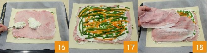 Then continue starting again with a layer of ricotta 16, one of vegetables 17, and another of cooked ham 18 until the ingredients are used up, finishing with a layer of cooked ham.