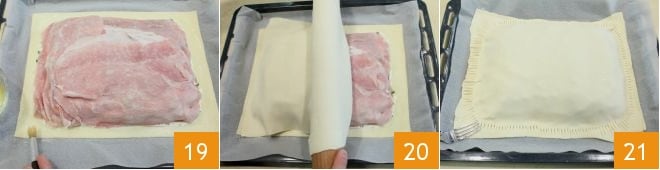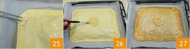 to decorate the corners 25 and the center of the puff pastry, then brush the entire surface with the beaten yolk 26. Place the puff pastry in the refrigerator for about 10 minutes: this will cool the pastry and help it hold its shape during baking. After the necessary time, bake the puff pastry in a preheated static oven at 356°F for about 30 minutes (320°F for 20 minutes if fan-assisted). Once cooked, remove from the oven 27, let it cool slightly, then remove from the mold and serve the puff pastry with ham, ricotta, and vegetables as a tasty appetizer, perhaps served in small cubes!