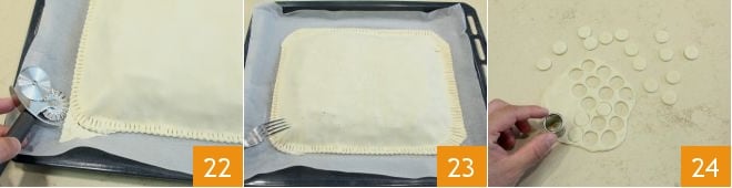Take the egg, separate the yolk from the white, and use the latter to brush the edges of the pastry 19; then place the other rectangle of pastry on top: roll the pastry onto the rolling pin, then unroll it 20 and seal the edges with the tines of a fork all around 21.