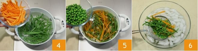 then the carrots 4 and peas 5, cook the vegetables for 7-8 minutes; they should remain crunchy. Then drain them and transfer them to a bowl full of ice: this will cool them immediately while keeping their brightness intact 6.