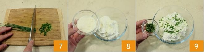 Set the vegetables aside and focus on the filling: finely chop the chives 7, then in a small bowl, add the ricotta and the grated cheese 8, the chopped chives 9