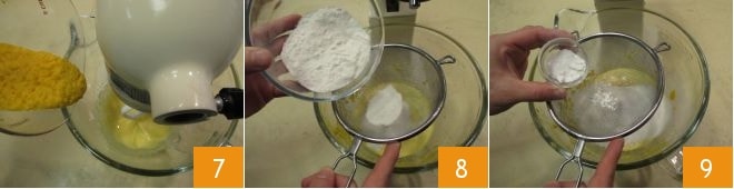 Add the pumpkin cream 7 and work again to combine it. At this point, sift the rice flour 8 and the baking powder 9 into the bowl,