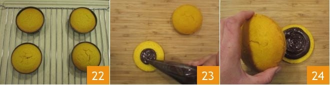 When the tartlets are cooked, remove them from the oven 22 and let them cool, then remove them from the molds and cut them in half transversely. Transfer the chocolate ganache into a piping bag and fill the lower half of the tartlets 23, then cover them with the other half 24.