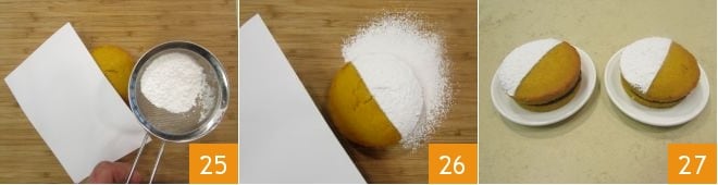 To create an original decoration, cover part of the surface of the tartlets with a sheet of paper and dust with powdered sugar (25-26). Your pumpkin and chocolate tartlets are ready to be enjoyed 27!