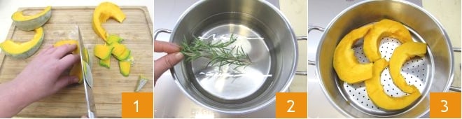 To prepare the pumpkin bread, start by cleaning the pumpkin: remove the seeds and internal filaments and cut it into wedges, also removing the skin 1. Place a pot with water on the stove and scent it with rosemary 4. Place the pumpkin wedges in the steaming basket 3,